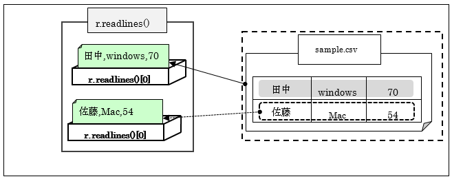 - イテラブルオブジェクト:r.readlines()※「sample.csv」の各行がリスト型で格納されています