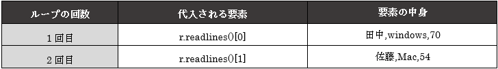 各セルのデータを取り出す上で、「r.readlines」には各行のデータが「カンマ,」区切りでまとめて文字列として格納されております。