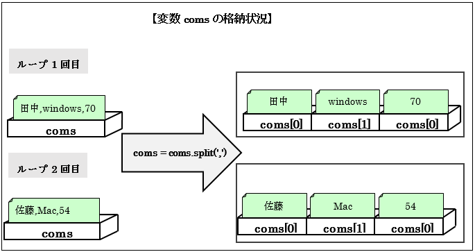 そのため5行目にて、split関数を介して文字列として格納されている各データの情報を、カンマ区切りで分割しリスト型変数として各セルのデータを、comsに格納し直します。