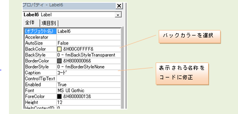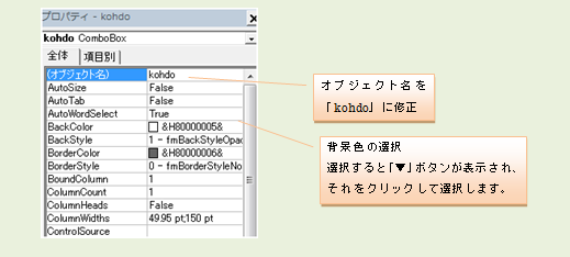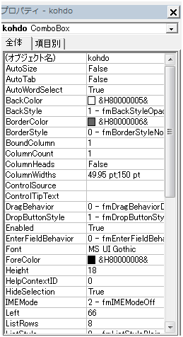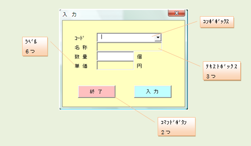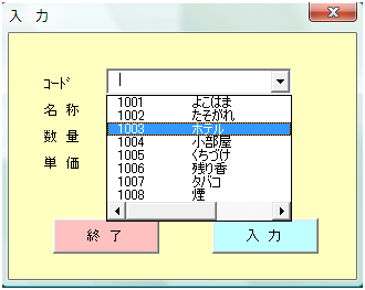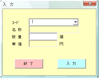 1. 「入力」フォームの作成 VBEの画面で、登録したいブックのProjectのどこか(この図では「Sheet1」)を選択し、 「ツールバー」の「挿入(I)」から、「ユーザーフォーム(U)」を選択します。 新しいユーザーフォームが作成されるので、ツールボックスで使用するコントロールを選択し、 ユーザーフォーム上に配置していきます。 各コントロールの大きさは、エクセルの図形等と同じ操作方法で変更できます。 必要な、ラベル、テキストッボクス、コンボボックス、及び、コマンドボタンを配置します。 配置したばかりのLabelは「Label1」などの表記のままなので、 各ラベルをマウスで選択して、左下のプロパティウィンドウのCaptionを上の図のように修正します。 バックカラーをフォームと同じ色にする代わりに、 「BackStyle」プロパティで、Labelの背景を透明にする方法もあります。 次に、コンボボックス、テキストボックスの「オブジェクトの名称」を修正していきます。 この例では、上から 「kohdo」、「namae」、「kazu」、「tanka」 同様にコマンドボタンのCaptionも「終了」、「入力」に修正します。 それぞれの色は、プロパティウィンドウの「BackColor」をクリックすると「▼」ボタンが表示されるので、 それをクリックすることにより、パレットから選択できます。 いよいよ、各コントロールに必要なプロシージャを設定をしていきます。 といっても、全てのコントロールに設定しなければいけないわけではありません。 この例では、2つのコマンドボタンと、コードのコンボボックスに設定します。 コンボボックスへの設定方法です。 コンボボックスのプロパティ値の変更箇所 オブジェクト名:kohdo BackColor: 薄い黄色 IMEMode : 新規入力を受け付ける場合には、ひらがな入力に設定するべきですが、 今回は修正していません。 RowSource :単位や、番号など不変のデータの場合は、ここに、下記の例の様に シート名から始まるセル位置を指定します。 ただし、マクロ実行時にアクティブになっているブックのシートに限られます。 設定例) 参照!C5:C20 シート「参照」のセルC5からC20のデータを表示する場合 今回は、プロシージャから設定しているため、ここでの設定はしません。 逆に、ここで指定すると、プロシージャからの設定ができなくなります。 コンボボックスで選択された項目を取得する方法 まず、フォームが表示されている状態で、コンボボックスをダブルクリックします。 すると、次のように、コンボボックスの内容が変更された時に動作する プロシージャが用意され、表示されます。 この間に、選択されたコードを取得して、商品の一覧表からそのコードの名称を取得し、 名称TextBoxに表示するソースコードを、記述していきます。 Dim strkohdo As String Dim strsyohin As String ' strkohdo = kohdo.Value If strkohdo = "" Then Exit Sub Set setcell = Worksheets("製品単価").Range("C7") cntA = 0 Do Until setcell.Value = strkohdo Or setcell.Value = "" Set setcell = setcell.Offset(1, 0) cntA = cntA + 1 Loop If setcell.Value = "" Then MsgBox "コードが見つかりません。" & Chr(13) & Chr(10) _ & "コードは一覧から選択してください!", vbCritical, "作業手順!" Exit Sub End If strsyohin = setcell.Offset(0, 1).Value namae.Value = strsyohin tanka.Value = "" まず、変数を宣言しますが、変数は、作成していくと必要な変数が判明してきます。 実際には、そのつど書き足していきます。 次に、コンボボックスの選択された項目を取得します。 選択された項目は、Valueプロパティで取得できます。 strkohdo = kohdo.Value チェンジイベントですので、コンボボックスの内容が変われば、空白に変わっても動作してしまいます。 空白に変わった時は意味がないので、プロシージャを終了させるための命令が次の行です。 If strkohdo = "" Then Exit Sub 次に、選択された項目に関連した他の項目の取得方法です。 コンボボックスには、何列ものデータを表示できますが、取得できるのは、指定した列 1つだけなのです。 格納するデータの列の指定には、「BoundColimn」プロパティで指定します。 デフォルトでは、「1」に設定されているので、一番左の列のデータをValueプロパティに格納します。 この例では、商品コードを格納しています。 次に、格納された商品コードを基に、SetステートメントとOffsetプロパティを使用して、他の項目を取得します。 ここでは、名称TextBoxに表示するための、商品名を取得します。 Set setcell = Worksheets("製品単価").Range("C7") cntA = 0 Do Until setcell.Value = strkohdo Or setcell.Value = "" Set setcell = setcell.Offset(1, 0) cntA = cntA + 1 Loop 製品単価の表にsetcellをセットしてセルの値がコードと同じになるまで、 Offsetプロパティで下の行に送っています。 cntAは、他のプロシージャで個数による商品単価を取得するためのものです。 そのため、setcellとcntAは、プロシージャの欄外で宣言し、他のプロシージャでも利用できるようにしています。 ユーザーフォームや、モジュール内でプロシージャの外にDimを用いて宣言した変数は、 そのモジュール内でのみ各プ