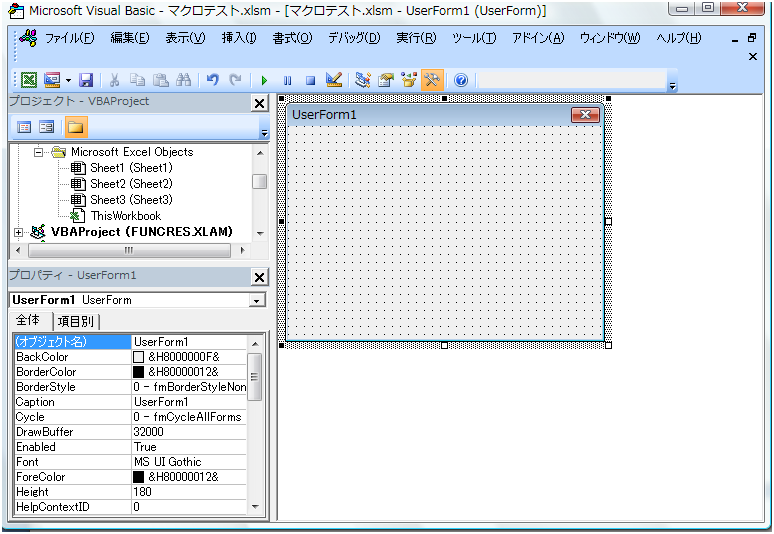 作成するユーザーフォームはたったの2つ。「マクロ表示」を実行すると、下のユーザーフォームが表示されます。 |