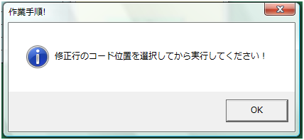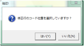 商品の個数を修正するときには、手作業で修正しても良いのですが、 個数により単価が変わるため、入力ミスの原因にもなります。 また、入力された製品を別のものに修正する場合には、 入力時と同じように、コードを選択して修正した方が、楽に行えます。 ただし、修正したい部分は、ユーザーにしかわかりません。 そのため、修正時にはユーザーに修正行のコードの入力位置を選択してから、 マクロを実行してもらうようにしています。 作業選択フォームの「修 正」ボタンをクリックすると、次のメッセージが表示され、 ユーザーに確認してもらい、「はい」なら処理を続行し、「いいえ」なら使用方法を説明するメーセージを表示し、 使い方を説明しています。 「作業選択」のフォームに直接記入しておくのも手ですが、 ろくに読まずにボタンを押す、8本足の方もたくさんいるので、このようにワンステップおくことも必要です。 |