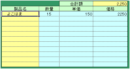 | ここで、商品コードを選ぶと、コンボボックスのチェンジイベントに設定したマクロにより、 「コードボックス」にはコードが、「名称ボックス」にはその名称が入力されます。 次に数量を入力すると、数量を入力したテキストボックスのチェンジイベントに設定したマクロが働き、 商品の個数によって異なる単価が正しく選択されて、「単価ボックス」に表示されます。 |