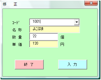 次に、入力作業のスタートとなる「作業選択」のユーザーフォームです。 こちらは、簡単です。 ユーザーフォームにコマンドボタンを3つ配置しただけです。 まず、ユーザフォームは、オブジェクト名を「マクロ」、Captionを「作業選択」 BackColerを薄い黄色に設定しています。 各コマンドボタンは、CaptionとBackColerのプロパティ値を変更して上の図のようにしています。 「入力」ボタンに設定したプロシージャ コマンドボタンをダブルクリックして、下記のプロシージャを作成します。 Private Sub CommandButton1_Click() ' kombosettei 'フォームを入力用に設定 With 入力 .Caption = "入 力" .BackColor = &HC0FFFF End With Unload マクロ 入力.Show End Sub このボタンをクリックすると、入力フォームが入力用にセットされ、表示されます。 といっても、何も難しいことはしていなくて、コンボボックスにコード番号と商品名の一覧をセットし、 入力フォームのキャプションを「入 力」に、バックカラーを薄い黄色にセットしてから フォームを表示するだけです。 フォームの色を「入 力」と「修 正」で違う色にしているのは、 ユーザーがどっちを選択しているか把握しやすくするという、とても優しい心遣いからです(笑) 「マクロ」ユーザーフォームを画面から消した後に、 プロパティの設定を「入 力」用に変更したユーザーフォームを表示して終了です。 コンボボックスの設定は、「入 力」でも「修 正」でも同じ作業のため、サブルーチンとしています。 「修 正」ボタンに設定したプロシージャ Private Sub CommandButton2_Click() Dim r As Integer ' r = MsgBox("修正行のコード位置を選択していますか?", 36, "確認!") Select Case r Case 7 MsgBox "修正行のコード位置を選択してから実行してください!", 64, "作業手順!" Unload マクロ Exit Sub End Select kombosettei 'フォームを修正用に設定、修正行の値代入 With 入力 .Caption = "修 正" .BackColor = &HC0FFC0 .kohdo.Text = ActiveCell.Offset(0, 0).Value .kazu.Text = ActiveCell.Offset(0, 2).Value End With Unload マクロ 入力.Show End Sub 修正ボタンなので、入力位置が選択された位置となります。 そのため、マウスによる選択位置の確認作業を行っています。 コンボボックスの設定を「入 力」ボタンと同様に行った後、 入力行に入力されているコードを、入力フォームのコードコマンドボックス(kohdo)に入力し、 数量を数量テキストボックス(kazu)に入力した後、マクロを画面上から消し、 「入力フォーム」を表示します。 実際は、選択された行に入力されているコード(ActiveCell.Offset(0, 0).Value)を、 「入力フォーム」のコードコマンドボックスに設定した段階で、 コンボボックス【kohdo】のチェンジイベントが実行され、 商品名が、名称テキストボックス(namae)に、 数量テキストボックス【kazu】には、数量(ActiveCell.Offset(0, 2).Value)が 設定されます。加えて、数量が設定された段階で、入力フォーム【kazu】のチェンジイベントが実行されます。 入力フォームが表示された時には、入力行に入力されている項目全てが、 入力フォームに表示されている状態となります。 ちょっとわかりずらかったかもしれませんが、チェンジイベントは、ユーザーからの入力時だけでなく、 マクロで設定したときにも、その内容が変更されれば実行されます。 2つのボタンで共用して使用しているサブルーチン【kombosettei】の説明です。 このサブルーチンで、コンボボックスに商品コードと商品名を設定しています。 Function kombosettei() Dim cntC As Integer Dim setcell As Range 'コマンドボックスの設定 cntC = 0 With 入力.kohdo .ColumnCount = 2 Set setcell = Worksheets("製品単価").Range("C7") 'RowSourceの入力 Do Until setcell.Value = "" .AddItem .List(cntC, 0) = setcell.Offset(0, 0).Value .List(cntC, 1) = setcell.Offset(0, 1).Value Set setcell = setcell.Offset(1, 0) cntC = cntC + 1 Loop End With End Function ここでは、「Sub」ではなくて、「Function」としていますが、「Sub」でも何も問題はありません。 サブルーチンとして作成しているため、その判別方法のひとつとして「Function」にしているだけです。 ここでも、Setステートメントを用いて単価表のコードナンバーと商品名を、 入力フォームのコードコンボボックス【kohdo】に設定しています。 単価表が空白行になるまで、AddItem で項目の追加を宣言したあと、Listプロパティの設定を繰り返しています。 このサブルーチンは、「作業選択」のフォーム内でのみ使用しているので、他のチェンジイベントと同じように フォーム内に記述していますが、 他のフォームでも使用したい場合には、標準モジュールに書かないと使用できません。 さて、残るは、「キャンセル」ボタンのみです。 マクロを表示させ、いきなりキャンセルボタンを押すような人には、 MsgBoxを使って、「こら! もっと考えてからボタンをクリックしろ タコ」と表示したくなりますが、 大人なので、そんなことはできません。 男は黙って次のプロシージャです。 Private Sub キャンセル_Click() Unload マクロ End Sub これで、このマクロを実行するための全てのプロシージャ