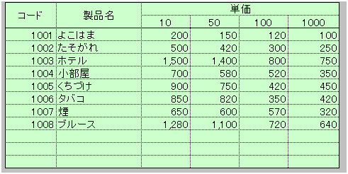 コード、商品名、個数により 異なった単価が、入力されている 価格表です。 |
