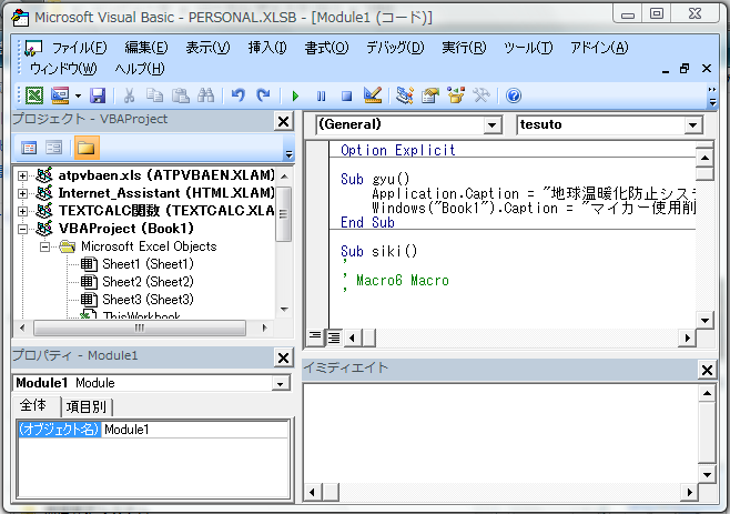 イミディエイトウィンドウ「イミディエイト」 日本語にすると 「ただちに、すぐに」という意味ですが、 このエクセル VBEのイミディエイトウィンドウを利用すると、わざわざプロシージャ を作成しなくても簡単なステートメントを実行することができます。 知らなくてもいいかな?という程度のものだと思いますが、 知っていてもいいと思います。(ナンジャそら!) 通常のモジュールに書くプロシージャに必要な Sub ****() End Sub の記述もイミディエイトウィンドウでは必要なく、 ステートメントの動作チェック用ウィンドウと理解してください。 |