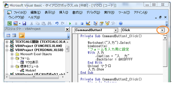 イベントを変更する場合は、そのメニューのイベントをクリックすれば、 新たに選択されたイベント用のプロシージャタイトルとEnd Subステートメントが作成されます。 実は、私も、イベントを全て理解して使用しているわけではありません。 中には「いつ使うんだ?」というものもあります。 で、「Change」、「AfterUpdate」「Click」、「QeryClose」の4つをメインに使用しています。 あと、ワークブックを開いたと時の「Workbook_Open」と閉じるときの「Workbook_BeforeClose」です。 この2つは、通常のモジュールではなくて、 プロジェクトエクスプローラー(画面左上)のMicrosoft Excel Objectsの下層にある 「This Workbook」に記述します。 他は、「こんなものもあるんだ」ぐらいで、必要になったらよく読みましょう! |