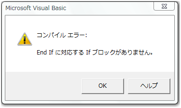 Withステートメントは、「With オブジェクト」で始まり、「End With」で終わります。 「With」と「End With」の間に記述するソースコードで、「setcell」に対するものである場合には、 オブジェクト名を省略して、そのことを表す「.」(ドット)を必ず付けます。 つまり、 setcell.Offset(0, 0).Value = strkohdo から、オブジェクト名の「setcell」を取った形の .Offset(0, 0).Value = strkohdo という具合です。 まあ、忘れた場合でも、「VBAProjectのコンパイル」による構文エラーチェックには引っ掛かるので、 すぐに見つけることができます。 その時のエラーメッセージが次の図です。 「.」(ドットを忘れると、subかFunctionだとExcelは判断してしまうということです。 Withステートメントの中でも、他のステートメントも使用できますし、指定したオブジェクトの操作も可能です。 With 入力.kohdo .ColumnCount = 2 Set setcell = Worksheets("製品単価").Range("C7") 'RowSourceの入力 Do Until setcell.Value = "" .AddItem .List(cntA, 0) = setcell.Offset(0, 0).Value .List(cntA, 1) = setcell.Offset(0, 1).Value Set setcell = setcell.Offset(1, 0) cntA = cntA + 1 Loop End With この例は、ユーザーインターフェースで説明したプロシージャですが、 Withステートメントのなかで、Do Loopステートメント、Setステートメントを使用しています。 次のように、入れ子にすることもできます。 With Range("A1") セルA1に対するWithステートメント .Value = "Withステートメントの説明" With .Font セルA1のフォントに対するWithステートメント .Name = "MS 明朝" .Bold = True .Size = 14 End With End With 「End With」の記述を忘れるとエラーになります。 「VBAProjectのコンパイル」による構文エラーチェックには引っ掛かりますが、Ifステートメントと 同時に使用した場合などは、下の図のようなメッセージが表示されるので注意が必要です。 If Range("A1").Value = "" Then With Range("A1") .Value = "" .Value = "Withステートメントの説明" With .Font .Name = "MS 明朝" .Bold = True .Size = 14 ここに「End With」が無い End With End If 上のように、Ifステートメントの中で、 「End With」の記述を一つ忘れて「VBAProjectのコンパイル」を実行すると と、エラーの原因を想像しにくいメッセージが表示されます。 また、ある参照セルに対し、Withステートメントを使用した場合に、Withステートメントのなかで、 その参照セルの位置を変更しても、反映されず、元の位置のままとなります。 Sub muridesu() Dim setcell As Object Dim i As Integer Set setcell = Range("C5") For i = 1 To 5 With setcell .Value = "Withステートメントの説明" Set setcell = setcell.Offset(1, 0) .Value = "できません" End With Next End Sub 上は、無理やり作った例ですが、setcellのWithステートメントのなかで、setcellを1つ下に送っています。 このような場合は、構文エラーにはなりませんが、Set setcell = setcell.Offset(1, 0)は無効となり、 最初に宣言した、セル("C5")に「できません」が入力されます。 Withステートメントを宣言したオブジェクトを変更する場合は、End Withでステートメントを終了させ、 変更後に再び、宣言する必要があります。 このような落とし穴的なものがエクセルに限らずVBAには結構あるので、注意が必要です。 |