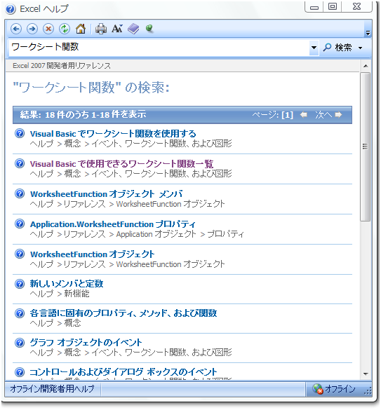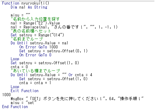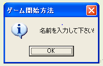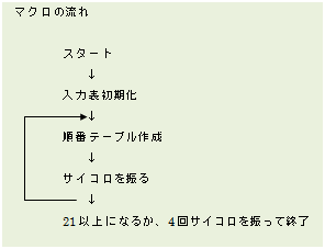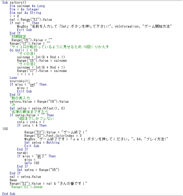 では、いよいよ本題に入ります。 1.「Set」ボタンに登録するプロシージャの作成です。 ここでは、入力表や、サイコロの値を消去して、名前欄の一番左の人を上部に表示する初期設定を行います。 Sub syokisetto() Dim na1 As String 1 Range("O5:P12").ClearContents 2 Range("C15:J19").ClearContents 3 narabi 4 Set setna = Range("O5") 5 na1 = setna.Value 6 If na1 = "" Then MsgBox "名前を入力して下さい!", vbInformation, "ゲーム開始方法" Exit Sub End If Range("E2").Value = na1 & "さんの番です!" 7 Range("E2").Font.ColorIndex = 5 8 'Range("E2").Speak 9 Range("C5").Value = "" 10 Range("C7").Value = "" 11 End Sub 1. 変数宣言行 「na1」:文字列変数 2.点数順に並べるテーブルを消去 2順目以降は、成績の悪い順になるため、そのために「O5:P12」に作成してあるテーブルを消去。 3.点数表消去 4.並び替えプロシージャ 同じ作業を他のプロシージャでも何度も行うため、別のプロシージャにして、 ここでそれを呼び出しその操作を行っています。 このように、プローシージャの中からも、他のプロシージャを名前で呼び出して使用できます。 5.Setステートメントです。非常に便利で、多用しています。 参照セルを他のブックやシートのセルに設定することができ、 Offsetプロパティと組み合わせれば、データベースの検索も自由自在に行えます。 ここでは、「narabi」サブルーチンで、順番テーブルを作成しているので、 そのテーブル一番上の名前のセルに参照セル(setna)をセットして、今後の操作に備えます。 「setna」は、他のプロシージャでも共用しているため、このプローシージャ内では変数宣言していません。 「変数」の詳細は「変数」の章で説明します。 6.変数「na1」に参照セルに入力されている名前を代入しています。 Ifステートメントで名前が入力されていない場合の処理を設定しています。 名前が入力されていない場合はMsgBox関数でメッセージを表示して「Exit Sub」で処理を終了します。 Setステートメント Ifステートメント MsgBox関数 名前が何も入力されていない状態で実行すると、エラーとなる操作もあるので、 このボタンだけでなく、それぞれのボタン全てに同じような処理を加えています。 どこにでもいる(?) 何も考えずにボタンをクリックする足が8本もある人の、操作に備えています。 7.次に、ゲームをする人の名前に「**さんの番です!」を付けて、上部セルに入力します。 これで、ゲームの参加者に、次は誰がサイコロを振ればいいか知らせます。 8.ゲームが終了すると、順番の表示欄のフォントの色を「赤」に設定し「ゲームの終了」を表示しているため、 フォントの色を「青」に戻しておきます。 9.行頭に「’」(シングルコーテーション)を付けて眠らせていますが、エクセルに名前を読ませます。 (あなたのエクセルに読み上げ機能が付いている場合は、シングルコーテーションを消去してください。) 10,11 さいの目の値が表示されるセルの値を消去しています。消去の順番に意味はありません。 2.サイコロを振る順番を決めるためのプロシージャです。 行っていることは、順番テーブルに名前と合計点数を記入し、 点数の低い順にソートして、順番に並べ替えています。 これは、SubではなくてFunctionプロシージャにしていますが、 Functuionにすると、ツールバーの「マクロ」の一覧には表示されないので、ここでは使ってみました。 確認してみてください。 Functionプロシージャは、ユーザー設定関数を作成するときに主に使います。 Functionプロシージャは、関数と同じように値を返すことができ、 Subと違って関数として使用する場合は、戻り値のデータ型はプロシージャ名の後ろにAsに続けて指定します。 Function bunruihou(Number As Integer) As String Dim bunrui As String Select Case Number Case 1 bunrui = "郵便" Case 2 bunrui = "宅配便" Case 3 bunrui = "自社便" Case Else bunrui = "持参" End Select bunruihou = bunrui End Function Functionの場合は、End subではなくてEnd Functionで終わります。 この関数では、Select Caseステートメントを使い、 Numberが「1」なら、「郵便」、 「2」なら「宅配便」と分類しています。 Select Caseステートメントは、単純な条件分岐でよく使う構文で、複雑な条件の場合には、 「If *** Then***」のIfステートメントを使います。 この関数の使用方法は、エクセルの他の関数と同じで、 セルC5に番号記入欄を設けている場合 どこかのセルに 「= bunruihou(C5)」と入力すれば、セルC5の値によって あなたが設定した分類方法が表示されます。 これがユーザー設定関数の例です。 ユーザー定義関数もマクロと同じで、使用する場合には、 Functionプロシージャが登録されているBookが開かれている状態でなければなりません。 たえず使いたい場合はアドインとしてエクセルに登録する方法がお勧めです。 Offsetプロパティ ここでは、Offsetプロパティを使用して、参照セルの移動や、参照セル近辺のデータを取得しています。 参照セル.Offset(1、0)は、参照セルの1つ下のセルを指します。 参照セル.Offset(0、1)は、参照セルの1つ右のセルの指します。 