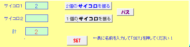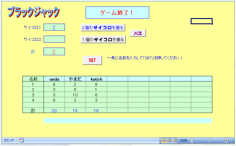 ゲームの説明 1. ゲーム参加者の名前を成績表の名前欄に入力し、「SET」ボタンにより初期化します。 2. 2つのサイコロを振るか、1つのサイコロを振るかは、参加者が選択します。 3. それぞれのボタンをクリックすると、1から6までの数字がランダムに選択され、 左側にあるサイコロ欄に入力されます。 4. 1順目は、左側の人から開始し、2順目以降は成績の低い人から上部に名前が表示されるので、 その順番でサイコロを振ります。 5. 21(ブラックジャック)になるか、または、それ以上になればその人のゲームは終了です。 ただし、成績が20未満でも、4回までしかサイコロは振れません。4回振って合計が17以下は、ドボンと同じです。 使用目的:職場などで、ジュース等を賭けてお楽しみいただけます。 |