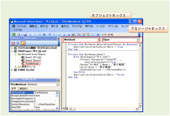 このゲームの様に、あらかじめ計算式等が入力されているシートを利用する場合は、 注意しなければならないことがあります。 それは、使用者による変更が出来ないように保護することです。 これはとてもだいじなことで、自分だけが使用する場合には必要ないと思いますが、 他人が使用する場合には必ず必要になります。 計算式の書き換えや消去、ドラグアンドドロップによるセルの移動など、 Excelには便利な機能がたくさんありますが、特に初心者の方は自覚なしにその操作を行いがちです。 ユーザーの無意識(?)な操作により、たとえば、表にある何かしらのキーワードを元に入力位置を探しても、 キーワードが見つからずにエラーとなったり、数式が消去されていたりなど、 マクロがエラーとなる原因はたくさんあります。 そこで、それらの予防手段として、シートに保護をかけます。 では、マクロによる保護のかけ方を紹介します。 1. 「Alt」+ 「F11」キーでVBEの画面を開きます。 2. プロジェクトエクスプローラーで、マクロを登録したいブックの「ThisWorkbook」を選択して、 「コードの表示」ボタンをクリックします。 3. オブジェクトボックスで「Workbook」を選択し、プロシージャボックスで「Open」を選択します。 4. 自動的に Private Sub Workbook_Open() End Sub が作成されます。 この間に書かれたプロシージャは、ブックが開かれたときに実行されます。 Private Sub Workbook_Open() With Worksheets("サイコロ") . Protect Password:="sheet85", _ userinterfaceonly:=True 1 .Range("A1:M35").Name = "表示範囲" 2 .ScrollArea = "表示範囲" 3 .EnableSelection = xlUnlockedCells 4 End With Application.DisplayScrollBars = False 5 End Sub 1. シートサイコロに「Sheet85」というパスワードをつけて保護をかけています。 また、保護をかけたままだとマクロからも操作できなくなるため、マクロからの操作はできるようにしておきます。 それが、「userinterfaceonly:=True」です。 この手のプロパティ値は、Trueが有効で、Falseが無効です。 2,3. セル(A1)から(M35)の範囲に「表示範囲」という名前を付けて、 スクロールエリア(ユーザーがスクロールして表示できる画面の範 囲)に設定しています。 4. ユーザーが、選択できるセルをあらかじめエクセルの「オプション」から 保護の「ロック」を解除したセルだけに設定しています。こうすると、保護のかかっているセルは、 選択することも出来なくなります。 5. 垂直、水平スクロールバーを画面から消してみました。 (必ず必要な操作ではありません。ちょっとしたカッコづけです。) 水平スクロールバーだけを非表示にする場合は、Windowsコレクションに対して Windows("Book1").DisplayHorizontalScrollBar = False 同様に、垂直スクロールバーだけを非表示にする場合は Windows("Book1").DisplayVerticalScrollBar = False とします。 このようにVBAでは、 あるオブジェクトの中にある特定のオブジェクトのプロパティに対して何らかの値をセットする または、 あるオブジェクトの中にある特定のオブジェクトに特定のメソッドを実行する。 という形で命令を記述していきます。 この作業に加えて、画面の罫線を消し、ツールバーも全て消して、大画面表示に変更すれば完璧?です。 (必ず必要な操作ではありません。) これらの操作は「マクロの記録」で記録できるので、試してみるといいでしょう。 ただし、ユーザーの画面には、どのツールバーが表示されているかわかりません。 どうしたらいいのでしょうか? 答えは、全てのツールバーを表示しないようにすればいいのです。 エクセルでは、このように表示されていないものに対して、 「表示しない」という操作を指示してもエラーにはならないからです。 このへんの知識はやっていくうちにわかってきます。 ここでちょっと注意 マクロで、あまり凝ったものは作成しないようにしましょう。 たとえば、画面の装飾に凝ったり、高度なテクニックを追求して使用したりすることです。 販売目的や、仕事が暇なときにはいいですが、必要でない作業に多くの労力を注ぎこみすぎると、 実際の仕事が進まなくなります。 マクロ作成の主目的は、あくまでも作業を自動化することにあります。 画面が汚くても仕事が進めばいいのです。マクロばかり改造していても 仕事は進みませんよ!(経験者談) 全てのシートに保護をかける このゲームでは、一つのシートに保護をかけていますが、 開いたブックの全てのシートに、保護をかける方法を説明しておきます。 Private Sub Workbook_Open() Dim Wsheet As Worksheet 1 Application.ScreenUpdating = False 2 For Each Wsheet In Worksheets 3 Wsheet.Protect Password:="sheet85", _ userinterfaceonly:=True Next Wsheet Application.ScreenUpdating = True 4 End Sub 1.変数宣言行 「Wsheet」をワークシートオブジェク変数に宣言 2.プロシージャが実行されると、リアルタイムに画面表示が更新されます。 場合によっては画面がちらつくので、スクリーンの更新を止めるように設定する方法で Applicationオブジェクトに対しScreenUpdatingプロパティにFlseを設定します。 3.ワーク