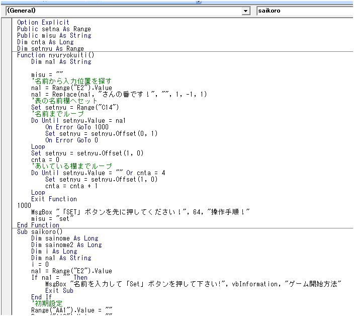 | 変数の名前 変数を使うときには、まず、あなたがその名前を決めてください。 パッと見でも、その変数の特性が分かりやすいものがいいです。 VBEのオンラインヘルプでは、効率のよい変数の名前として、 「データの型を表す文字」(その変数の役割を示すような文字)を勧めています。 簡単なプロシージャだと、変数も少なく、プロシージャも短いので、変数名は何でもいいと思います。 しかし、これが長いプロシージャだと、変数の宣言部分も画面から外れ、その変数の型は何かを確認する ためには、画面をスクロールして宣言部分を表示させなければ確認できなくなります。 VBEのオンラインヘルプの中に、「intX」や「intY」というような変数を多々みつけることができます。 この「int」がなければ、XやYというようにすっきりとしますが、上記の理由で、あとで説明する「Integer型」 の変数だということを示しているのです。 自分が分かればいいのですから、自分流の規則を作り、それに沿って変数の名前を付けてください。 1)変数だとわかる名前を付ける 2)プロシージャのタイトルや、VBAのキーワードと一致しない名前にする 3)どの型の変数か連想できる名前にする この程度を押さえておけば十分です。 変数の宣言 一部の説明が、<(ゲームで覚えるVBAプログラミング)の章>の説明とダブリますが、 もう一度おさらいをしておきましょう! 変数は、実際には特に宣言をせずに、ソースの中でいきなり使用してもエラーにはなりません。 それは、VBAには、「Variant型」という「どんな型のデータでも受け入れてくれる」 便利なデータ型があるからです。 宣言なしで使用された変数は、すべてこの型に設定されてしまいます。 ですが、このような使い方はできるだけ避けるようにします。 変数は、名前を付けられたメモリー領域のことですから、 どんな型のデータも入る「Variant型」の変数は、他の変数に比べ非常にたくさんのメモリーを必要とし、 それが原因で、Variant型の変数の多用は、処理速度の低下も招きます。 このVariant型の存在が、プログラムミスの原因となることがあります。 ソースの先頭行で正しく変数を宣言したとしても、変数名を入力したときにスペリングミスを犯すと、 その変数は宣言した変数とは違うVariant型の変数とみなされてしまうからです。 宣言したはずの変数に代入されるはずのものが、スペリングミスのせいで 他の変数に代入されてしまいます。 VBAには、構文エラーを見つける「プロジェクトのコンパイル」という機能がついていますが、 それを使用しても正常終了してしまいます。 スペリングミスは手作業で入力していくため、防げませんが スペリングミスを容易に発見することはできます。 それが、「Option Explicit」ステートメントです。 このステートメントを各Moduleの先頭で宣言すると、宣言した変数以外は使用できなくなります。 つまり、実行時にエラーと判断されるわけです。 また、「プロジェクトのコンパイル」でも見つけることができ、大変便利です。 新しくモジュールを作成するたびに、 「Option Explicit」ステートメントを自動的に挿入されるようにすることもできます。 VBEのメニューから「ツール(T)」⇒「オプション(O)」を選択し、 表示されたダイアログボックスの「変数の宣言を強制する(R)」チェックボックスにチェックマークを入れます。 変数の通用範囲 変数の宣言は、通常は、プロシージャ定義の先頭行、 Sub・・・ あるいは、Function・・・と書かれたすぐ下で行うと書きました。 つまり、そのプロシージャ内で宣言したことになります。 この場合、宣言された変数は、そのプロシージャの中だけで利用できるようになります。 プロシージャが終了してしまうとその変数も消えてしまい、 当然、代入も、その値を参照することもできなくなります。 しかし、同じ変数を複数のプロシージャで利用したい場合もあります。 そのような場合は、プロシージャの外、コードウィンドウの一番上で宣言します。 マウスカーソルを置いて「Enter」キーを押し、空白行を作ってそこに入力します。 そこにDimステートメントで宣言した変数は、そのモジュール内の全てのプロシージャで利用できます。 そこにPrivateステートメントで宣言した変数も、同じです。 また、全てのモジュール内のプロシージャで利用したい変数もあります。 その場合は「Public」ステートメントを使って宣言します。 ただし、Publicステートメントで宣言した変数は、どのプロシージャからも変更が可能なため、 プログラミングする上では、注意が必要です。 プロシージャが終了しても、自動的にクリアされず、Excelを終了するまで、その値を持ち続けます。 そのため、次のプロシージャの開始時に、意識的にクリアする必要もでてきます。 加えて、宣言する場所もモジュール1に限定するなどして、わかりやすくしておくべきでしょう。 エクセルでは、ワークシート上のセルを利用すれば、 Publicステー