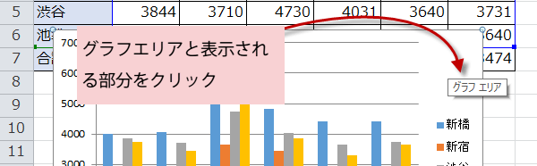 グラフ全体を選択するには、ポイントしたときにグラフエリアと表示される部分をクリックします。