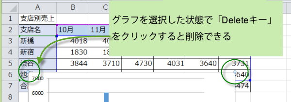 グラフを選択して「Deleate」キーをクリックすると、グラフを削除できます。