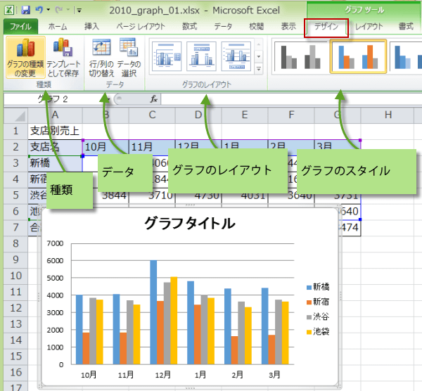 デザインタブは、グラフの種類を変更したり、グラフのレイアウトを変更したり、グラフのスタイルを変更したりするときに使います。