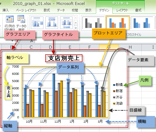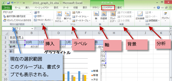 Excel2010のグラフツールのレイアウトタブは非常に多機能で使いやすいタブです。