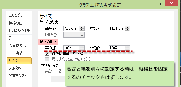 グラフをパーセントで指定して拡大縮小することもできます。書式タブのサイズグループの右角の矢印をクリックして、