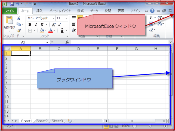 タイトルバーには、ブック名(Book2)とアプリケーション名(Microsoft