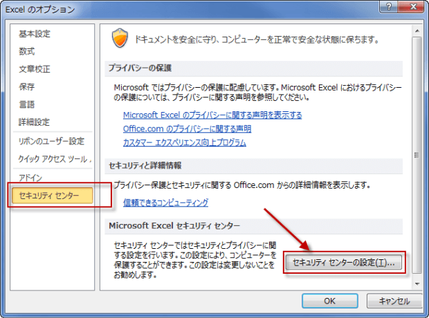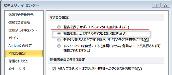 Excel2010 でマクロを有効にするには