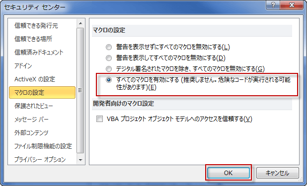 マクロの設定には、4種類あります。 マクロを有効にしたいなら、すべてのマクロを有効にするにチェックを入れて、OKをクリックします。