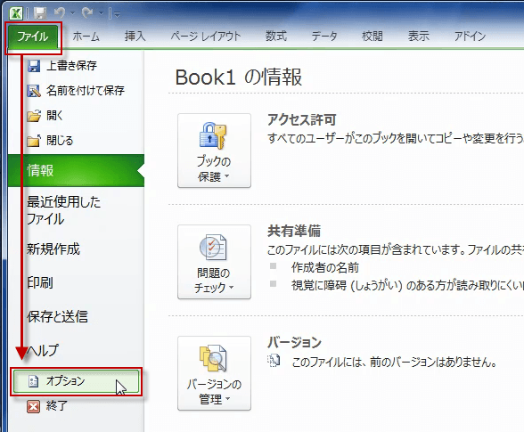 ファイルタブをクリックして、メニューからオプションをクリックします。