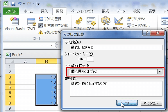 今回は、作業中のブックではなく、個人用マクロブックに保存します。
