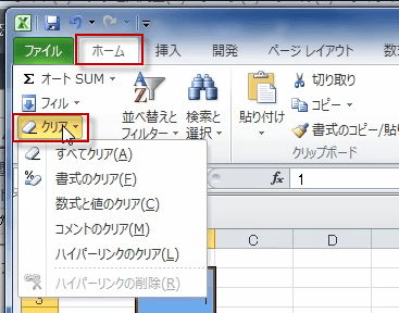 クリアには、バリエーションがあり、リボンのホームタブの中の、編集グループにあるクリアボタンをクリックすると現れます。