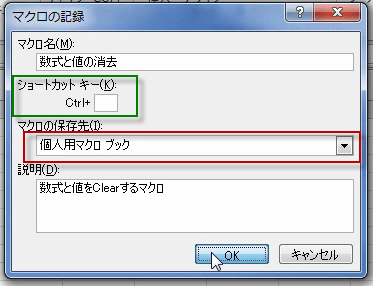 表示される[マクロオプション]ダイアログボックスでは、ショートカットキー