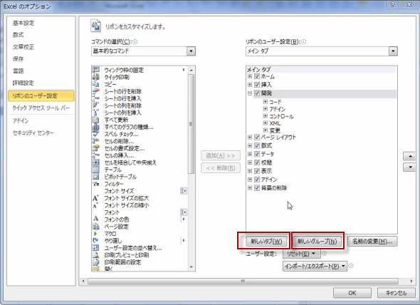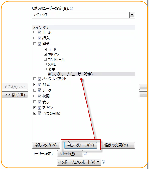 開発タブの中に、ユーザー設定の新しいグループを作成します。