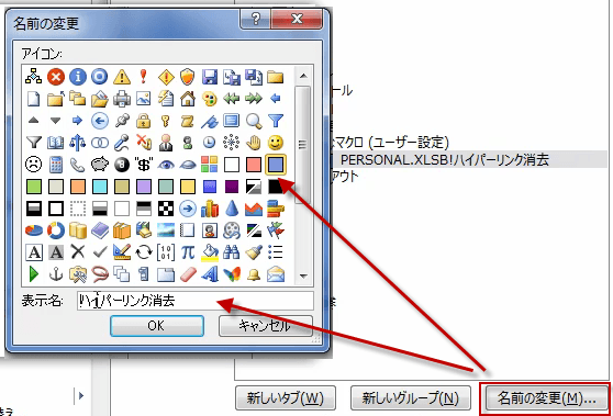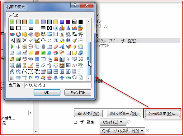 このあと、名前の変更ボタンを押して、アイコンを決め、マクロの名前を短くしておきましょう。