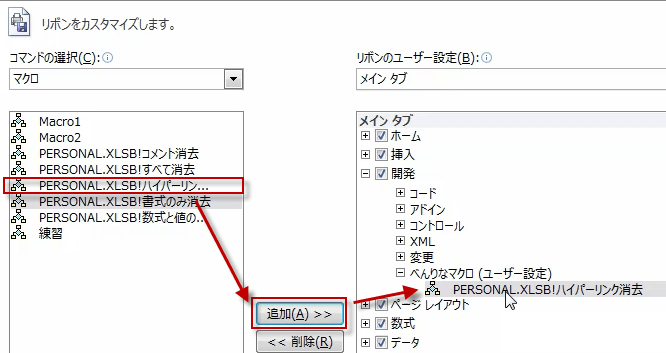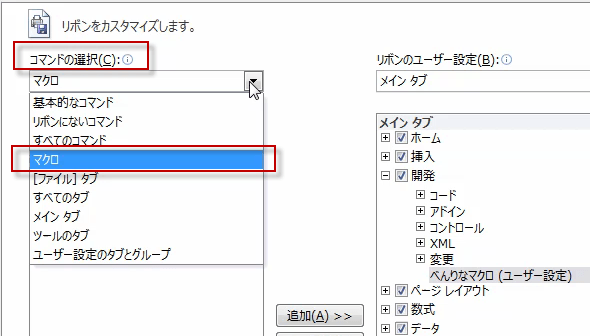 左側のコマンドの選択から、マクロを選び、表示されるマクロから登録したいマクロを選んで、追加ボタンを押します。