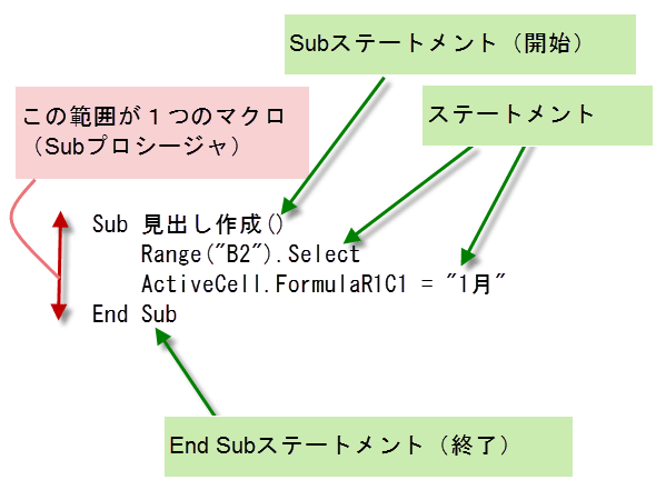マクロは、「ステートメント」と呼ばれる命令文の集まりです。