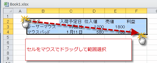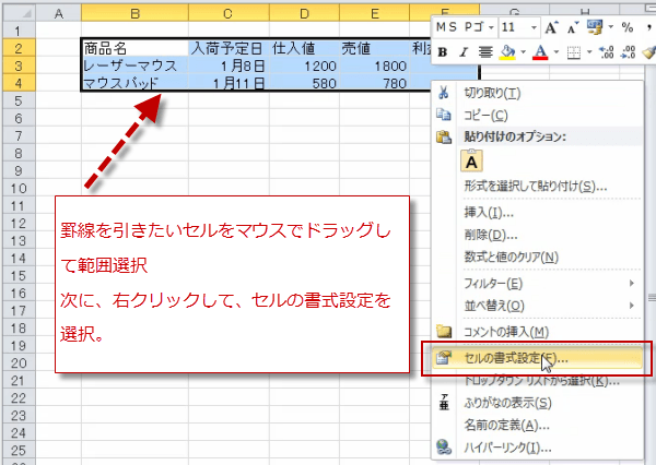 罫線を引きたいセルをマウスでドラッグして範囲を選択します。