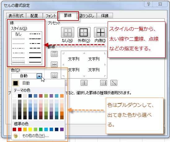 [罫線] タブでは、線のスタイルや色、罫線を引く場所を設定します。