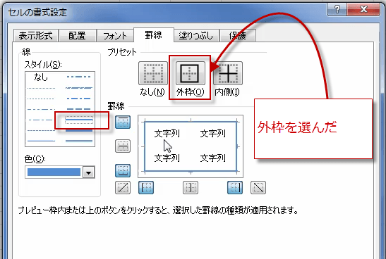 例では、プリセットからセルの四辺全部を線で囲む外枠を選びました。