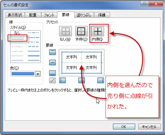 次に、スタイルで点線を選びプリセットで、内側を選びました。