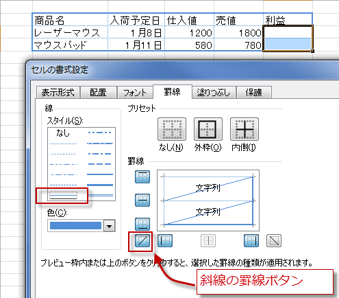 斜線の罫線ボタンをクリックすれば、セルを斜めに横切る斜線も引けます。