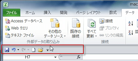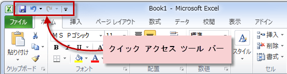 リボンの左上にある クイック アクセス ツール バー は、よく使う機能を登録し簡単に実行出来るようにするツールバーです。