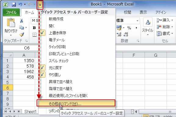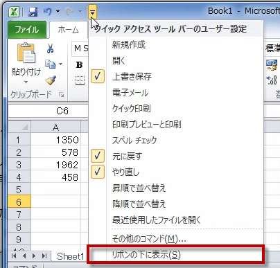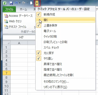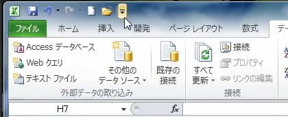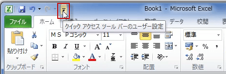 クイック アクセス ツール バーのユーザー設定▼を押し下げます。
