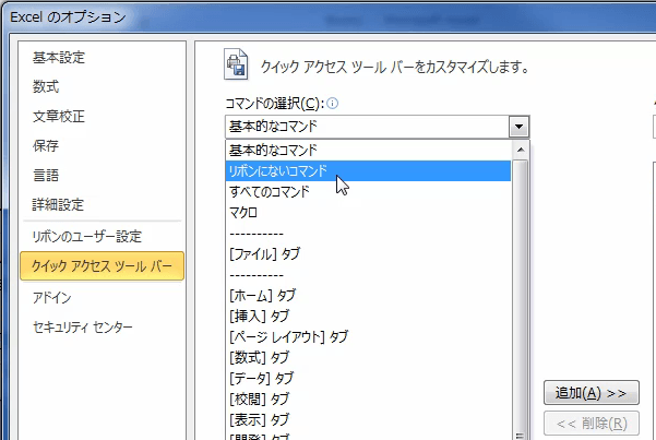 「リボンにないコマンド」「すべてのコマンド」から選択することができます。これによりユーザーは、クイック アクセス ツール バーをカスタマイズすることができます。