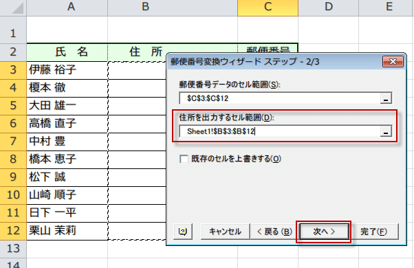 前のページで郵便番号辞書を最新版にしたので、安心して郵便番号変換ウィザードを使えます。