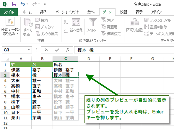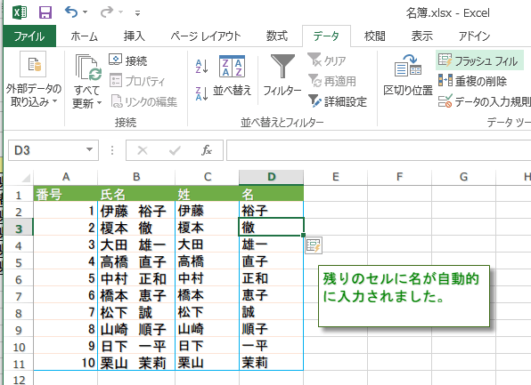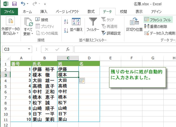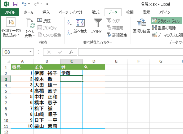 フラッシュフィルで名簿の姓と名を分けて入力する