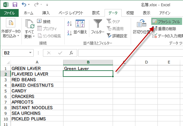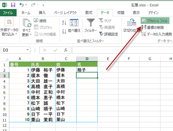 このとき、データタブのフラッシュフィルボタンをクリックします。