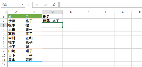 最初の伊藤を入力して、アクティブセルがC3に移動しています。