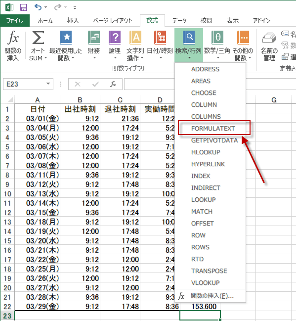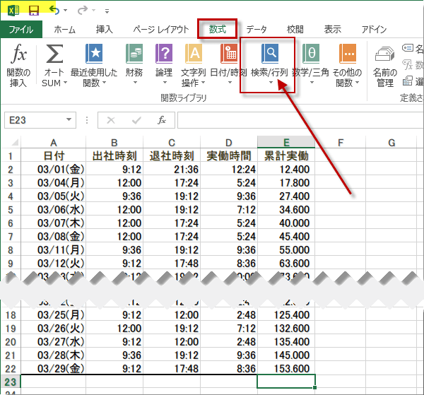 数式を表示したいセルを選択し、[数式]タブの[検索/行列]をクリックします。