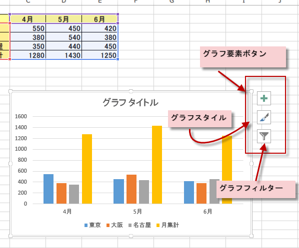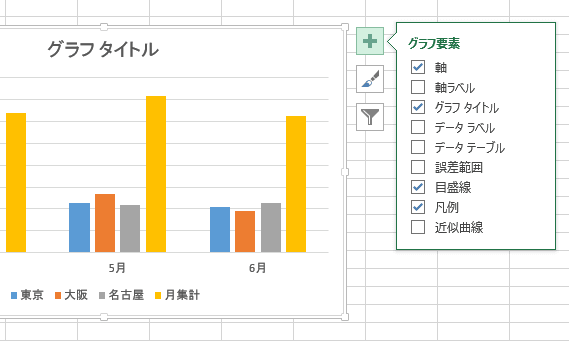 グラフ要素ボタンは、タイトル、凡例、グリッド線、データラベルなどのグラフ要素を追加・削除または変更します。