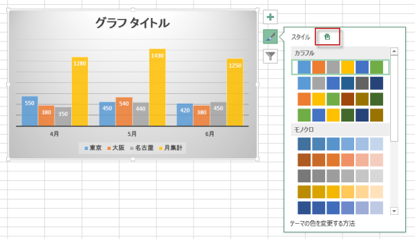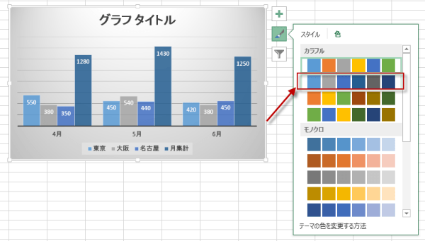 「グラフ スタイル」ボタンは、グラフの書式をスタイルと色で変更します。では、これを変更してみましょう。