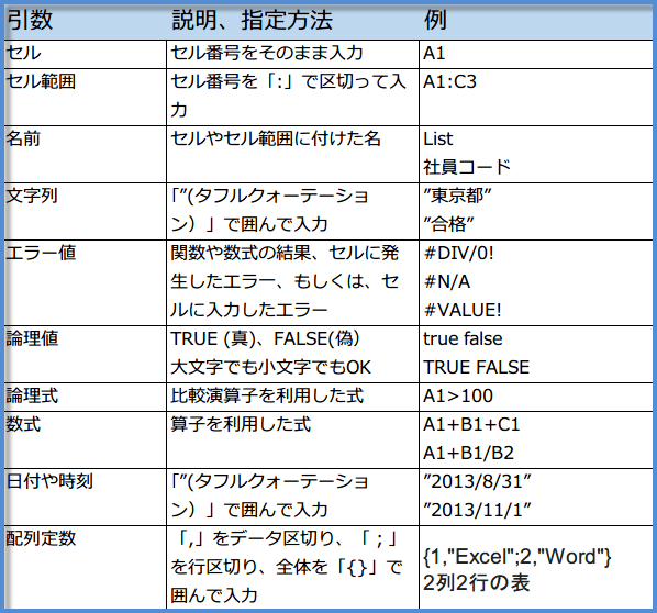 ただし、引数の種類によって指定方法に決まりがあります。