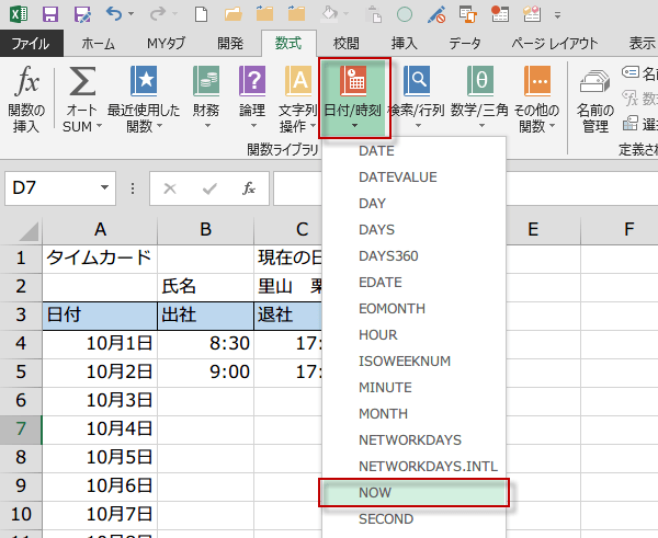 ここでは、日付/時刻関数から、NOW関数を選びます。