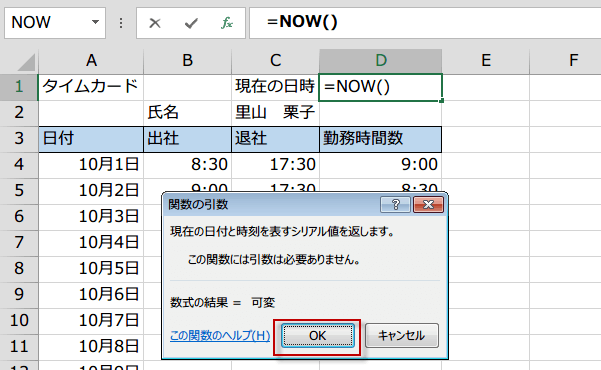 すると、関数の引数ダイアログが現れ、関数の説明と引数の説明が表示されます。引数は必要ないと表示されました。